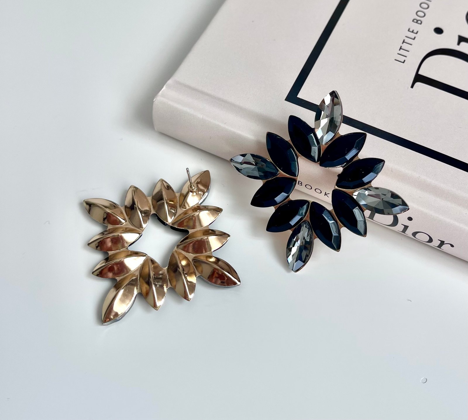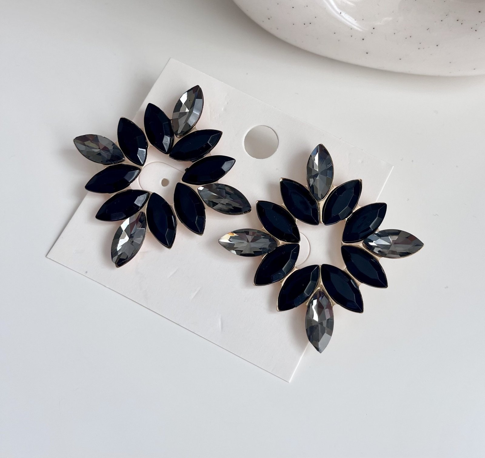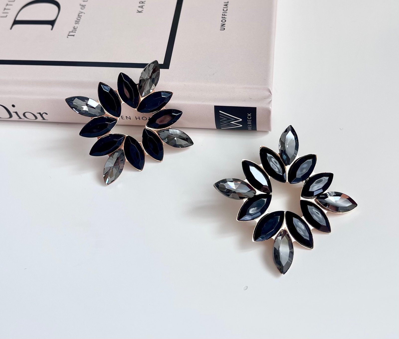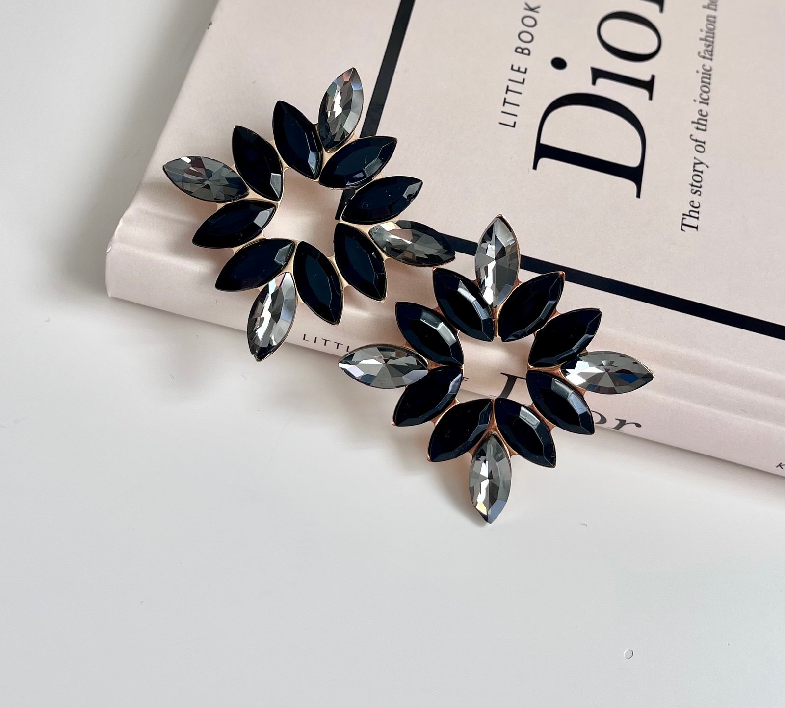 Луксозни обеци с кристали в черно и прозрачно черно. Основата е в златисто Обеците са леки за носене Размер: 5,2 см Закопчаване с винтче